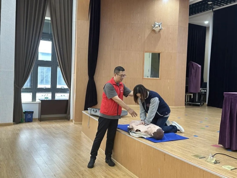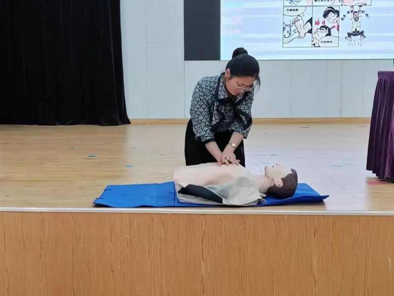 张主任向教师们 详细讲解了幼儿园常见的突发情况,当意外发生时,最有效的抢救时间只有短短4分钟的“黄金救命时间”。如何正确把握这4分钟,张主任借助仿真人体模型,通过实际操作向我们展示了心肺复苏术(CPR)的三个核心步骤:胸外心脏按压、打通气管、人工呼吸。