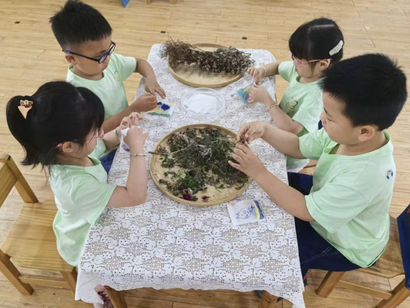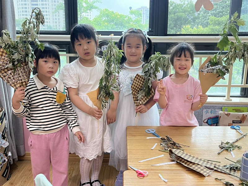在这个特殊的日子里,我们的幼儿园准备了好多有趣的活动。我们会一起动手包粽子、做艾草染蛋、蛋托龙舟、艾草花束diy,我们还会把自己做的香囊赠予给老师、同伴、家长。