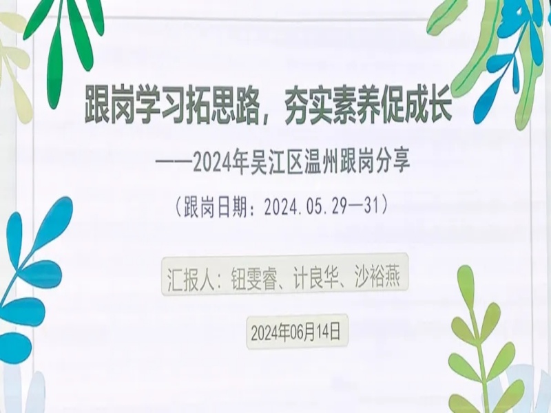 为加大研修辐射范围,进一步提升吴江区教师专业素养,2024年6月14日,吴江区震泽片进行了跟岗研修片区分享。杨嘉墀实验幼儿园钮雯睿、菀坪幼儿园计良华、水秀实验幼儿园沙裕燕三位园长老师进行了分享,吴江区震泽片的教师齐聚云端,聆听分享。