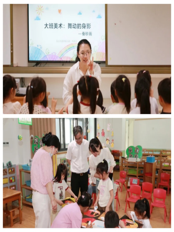 教师李祎可带领学生欣赏夕阳下舞者舞动的不同姿态,感受剪影艺术的美。她引导学生大胆创作、勾画舞者形象,并用蚕砂撒画的方式表现舞动时的剪影,让学生在创作中体验蚕砂画的乐趣。