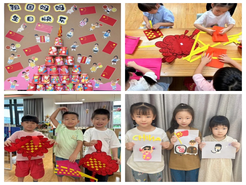 一双双灵巧的小手蕴含着满满当当的爱国情感。瞧,小班小朋友们为祖国妈妈做了漂亮的生日蛋糕,中班小朋友们玩起了中国结编织,大班小朋友们用一幅幅创意泥工作品致敬各行各业中奋斗奉献的中国人。