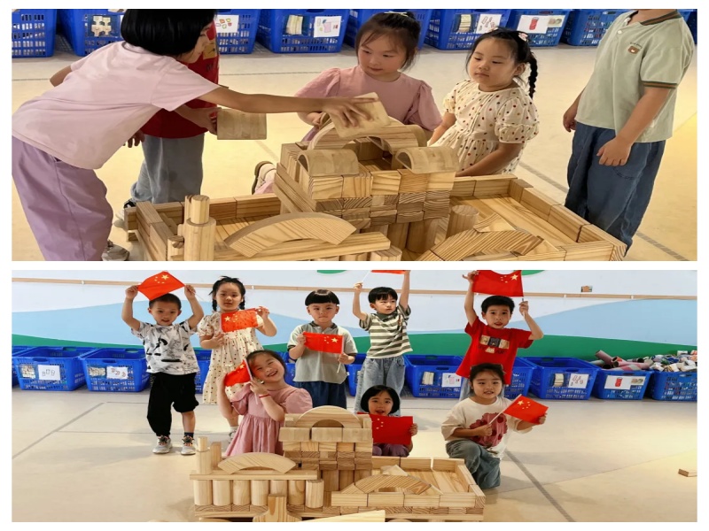 小朋友们通过照片的形式欣赏了雄伟壮观的天安门城楼,他们也想亲手搭一搭天安门呢!瞧,小朋友们用一块块积木建构出了别样的“天安门”!