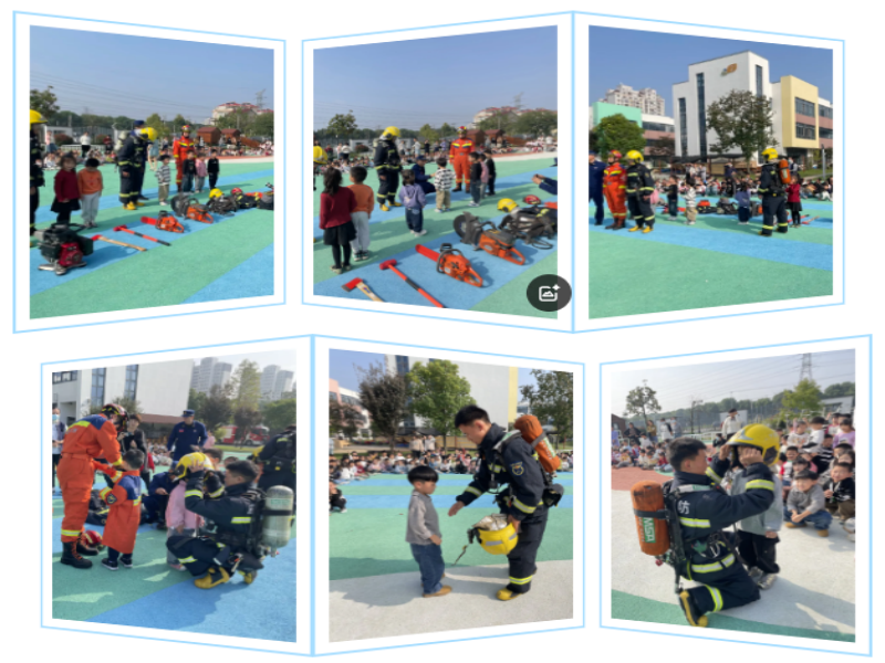 消防员叔叔们耐心地向小朋友们展示了防护服、呼吸面罩、灭火器等专业的消防装备,并生动讲解了遇到火情时应该如何迅速且正确地逃生等至关重要的消防安全知识。紧接着,消防员叔叔们、热情地邀请小朋友们亲自上阵体验一番:戴上沉甸甸的消防头盔、触摸庞大的消防器材、穿上密不透风的防护服……在这一系列的亲身实践中,孩子们深刻感受到了消防员叔叔的英勇与伟大。