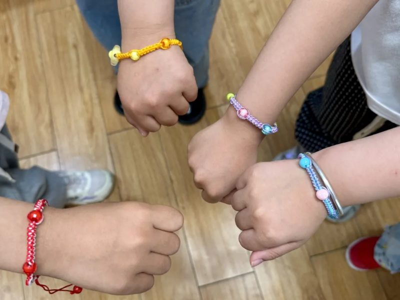 旧时,在立夏日用五色丝线系在孩子的手腕处,寓意消灾祈福不得疰夏病。瞧,小朋友们也编起了漂亮的手链,还把自己的祝福送给了更多的人。