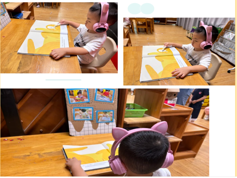 各班图书角特别设置了"好听的声音"专区,配备有声挂图和点读笔。孩子们可以自主点读,聆听标准的普通话发音,在潜移默化中培养语感。