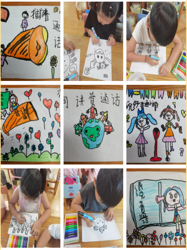 大班幼儿亲手绘制推普宣传画,用图画和简单的文字表达对推广普通话的理解。一幅幅充满童趣的作品,展现了孩子们对普通话的认同和喜爱。