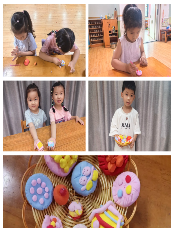 中班的宝贝们变身“小小糕点师”,用五彩的橡皮泥尽情发挥想象力,揉、捏、搓、压,创作出一个个色彩斑斓、造型各异的“五彩月饼”。有香甜“豆沙味”的粉色月饼,有诱人“蛋黄味”的金黄月饼,还有充满童趣的玉兔月饼……每一件作品都饱含着孩子们对中秋美食的憧憬与热爱。
