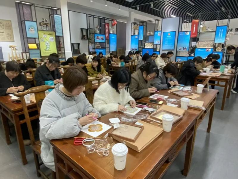 非遗体验环节,老师们在讲师指导下学习丝巾系法,指尖轻绕间尽显优雅。随后的宋锦珍珠相框制作中,大家巧手铺展非遗宋锦,点缀莹润珍珠,将匠心凝聚于方寸之间。党员教师齐聚一堂开展专题学习,研读教育文件精神,凝聚思想共识,进一步坚定教育初心。温馨的读书沙龙里,老师们卸下忙碌,在书页间沉静心灵,通过分享与交流遇见更好的自己。